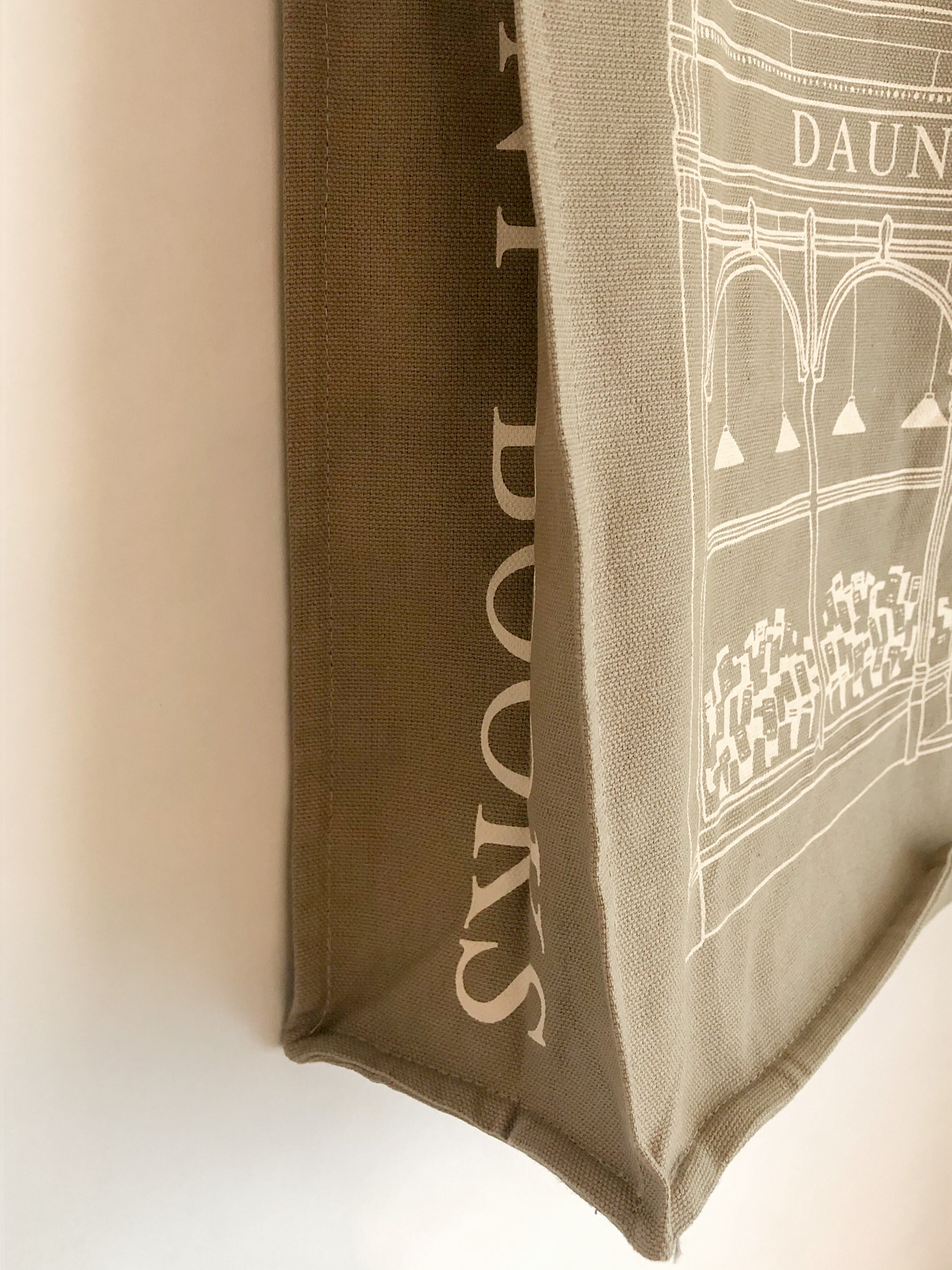 表裏面に店頭のイラストがプリントされています。エドワード朝の重厚な店構えに、ショップウインドー越しに本が陳列されたイラストは、書店の雰囲気をよく表しています。トートバッグの両サイドには「DAUNT BOOKS」の店名がプリントされています。