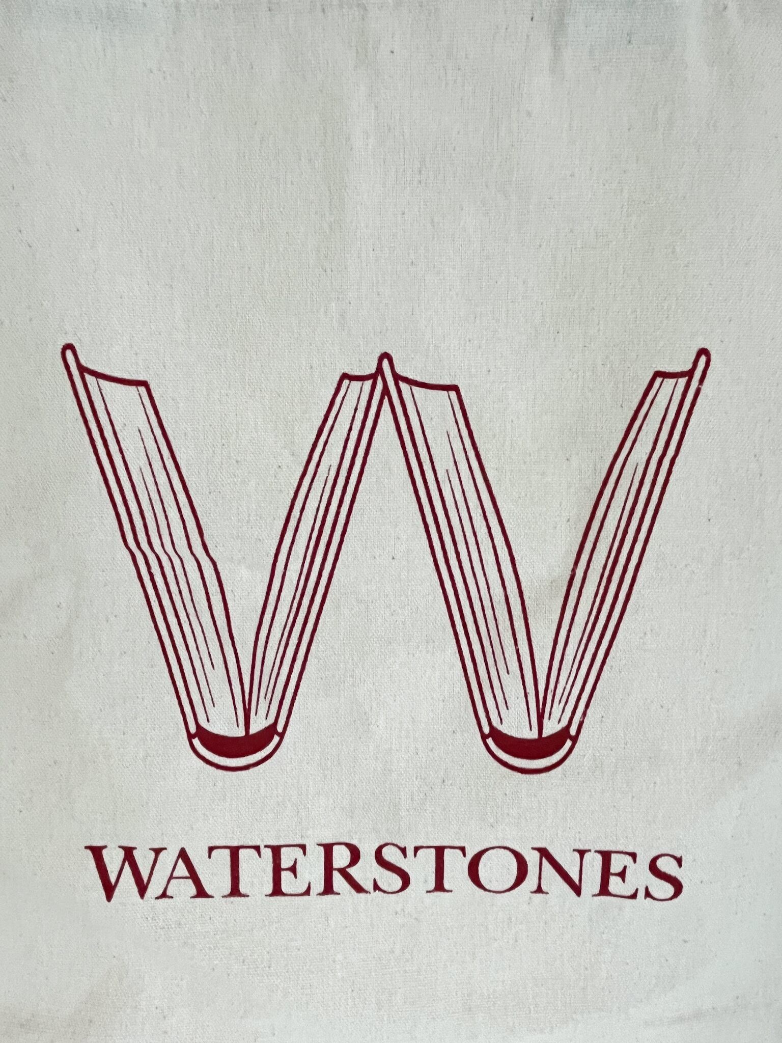 【イギリスを代表する有名書店WATERSTONESのトートバッグ。Wの字を描いた本のデザインがポイントです】