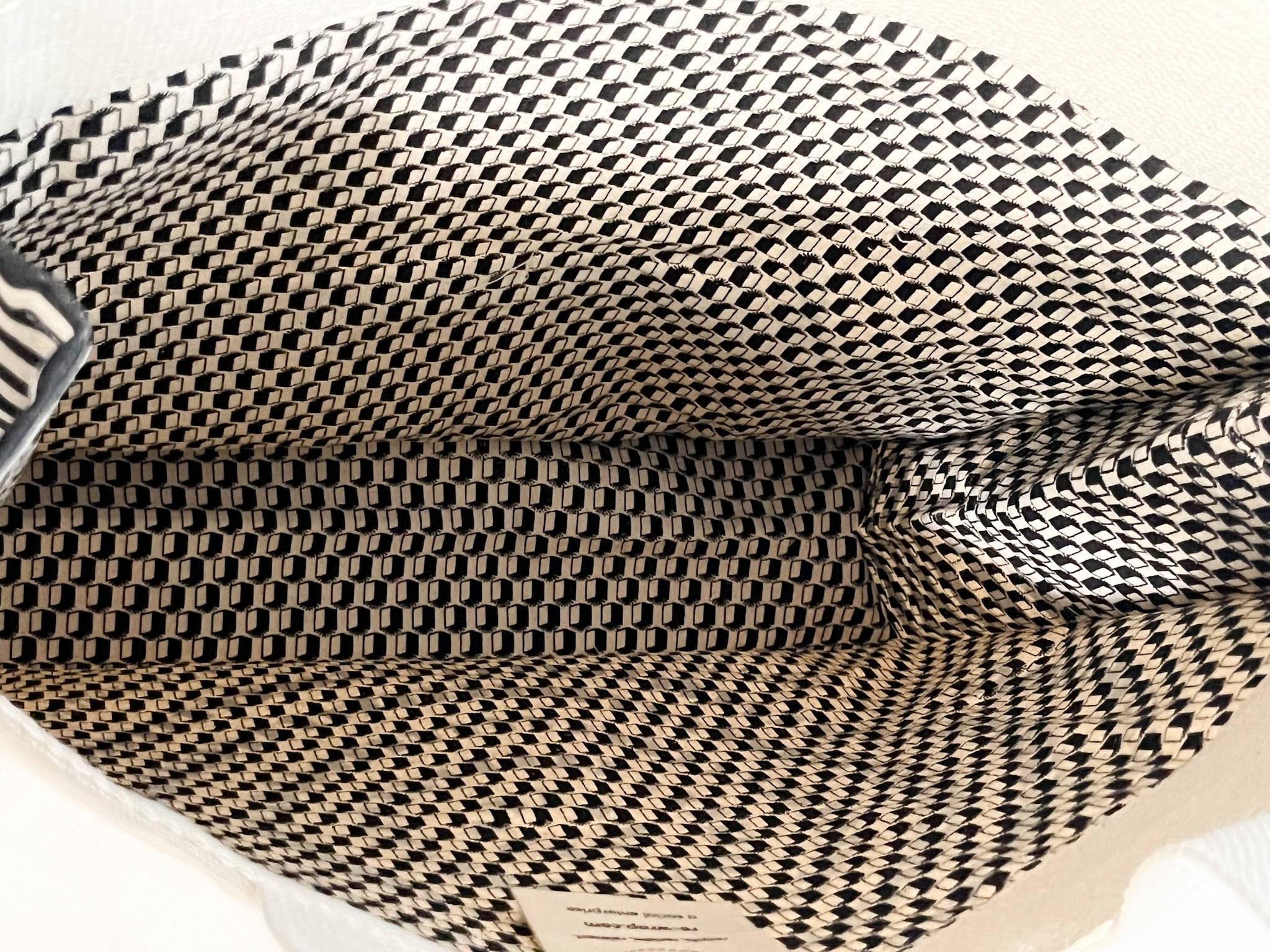 Mandalaと名付けられたバッグには、小さな本のイラストが並び、曼荼羅(まんだら)のように円を描いています。裏面にも小さな曼荼羅がいくつもプリントされています。バッグ側面はブラック&ホワイトのストライプがプリントされ、書店のスタイリッシュなイメージを残しています。