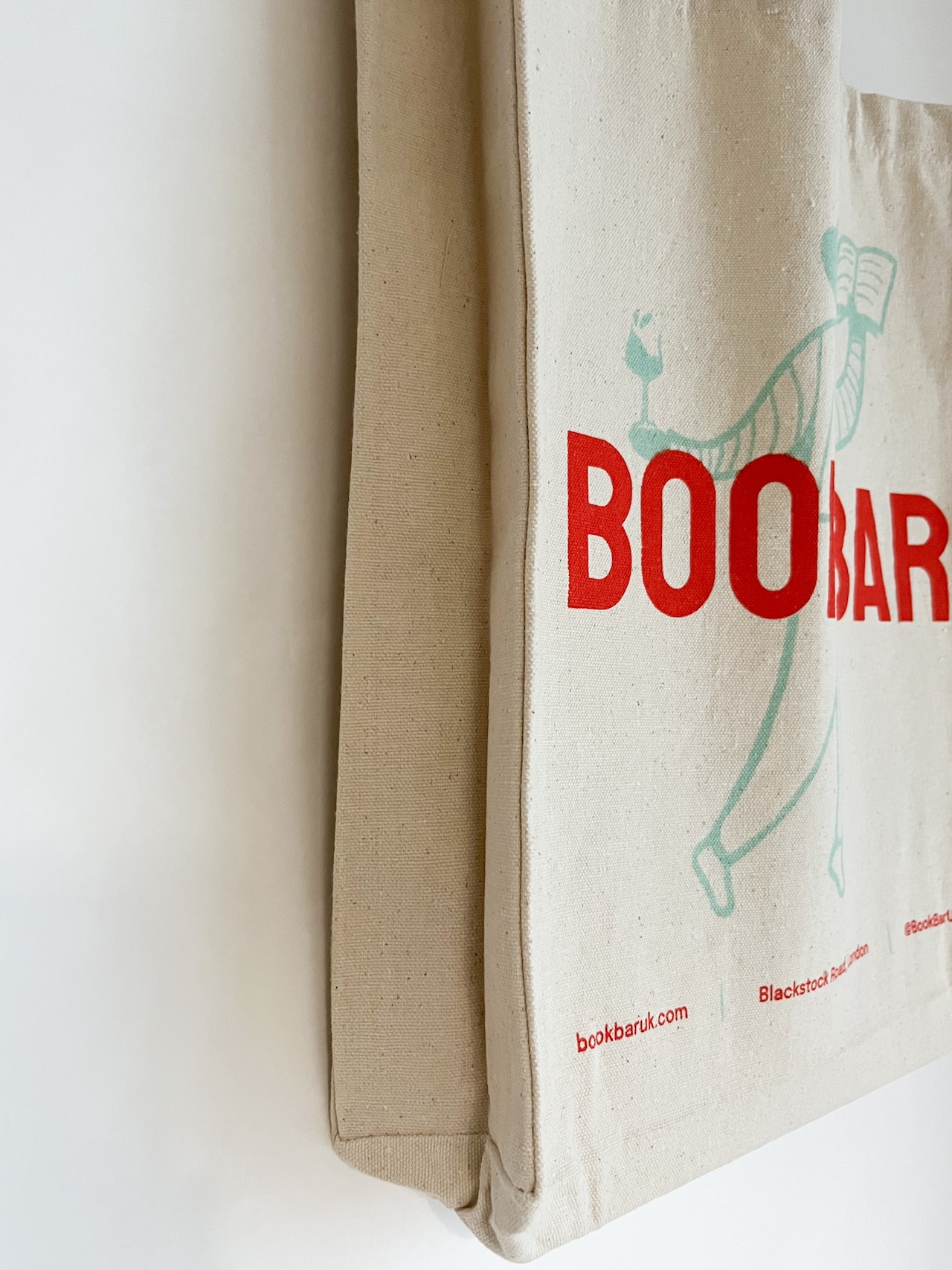 【本と一緒にお酒やコーヒーも楽しめる本屋さんBookBar。本とワインを楽しむ人がプリントされたイラストが特徴のトートバッグです。】