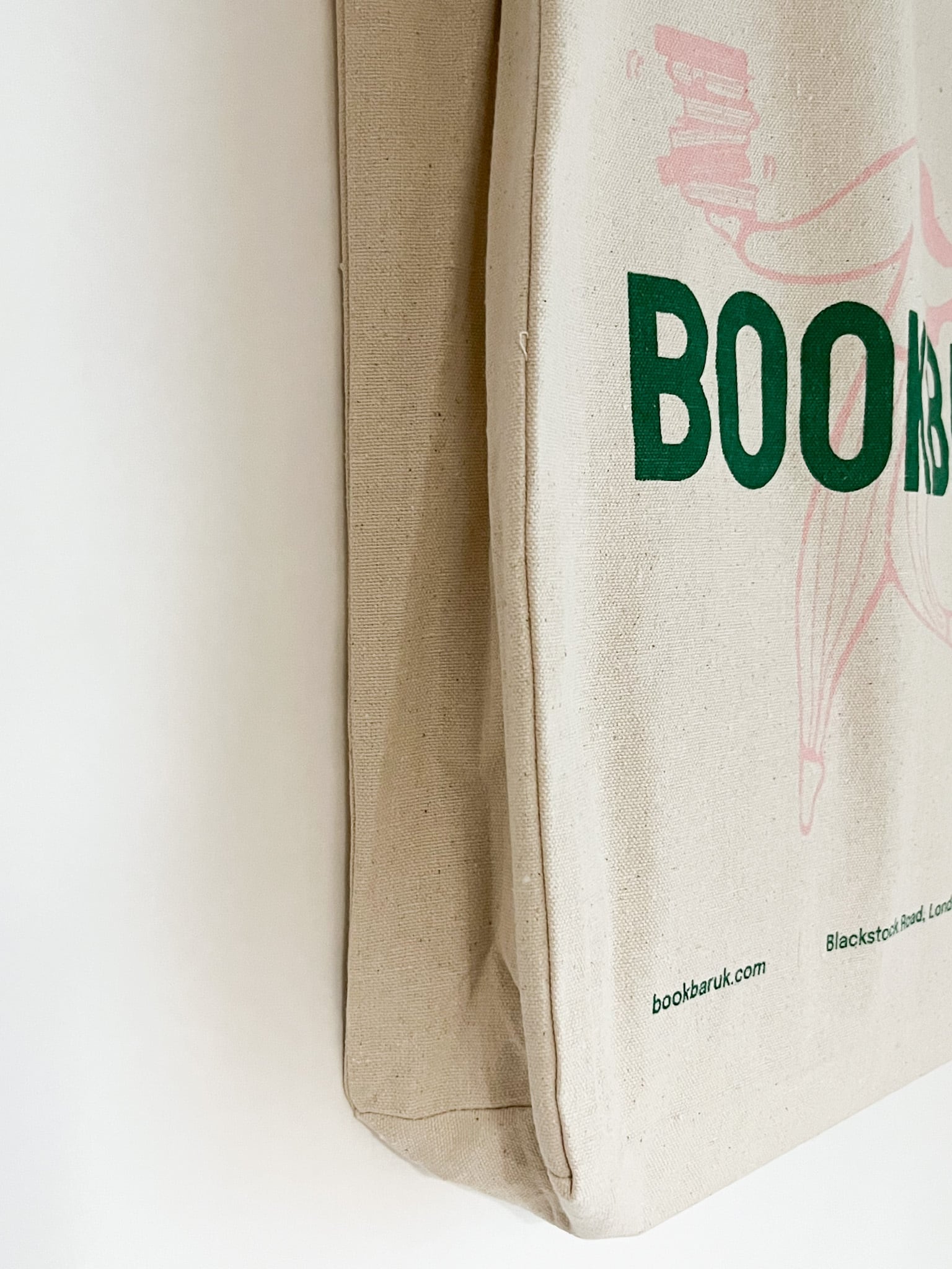 コットンの生地に、表面には店名ロゴと本とワインを持つ人のイラストが、裏面にはピンクのインクで「ASK ME WHAT I'M READING」とプリントされています。イラストやインクの緑とピンクの色の組み合わせにもセンスを感じます。お店のコンセプトを表現したイラストは、本とワインを愛する人にピッタリ。スタイリッシュでユニークな印象を与えてくれるはずです。